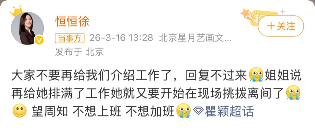 3月16日下午,瞿颖经纪人发文称:大家不要再给我们介绍工作了,回复不过来。 她还透露瞿颖已经表态,“说再给她排满了工作她就又要开始在现场挑拨离间了,望周知,不想上班,不想加班!”
