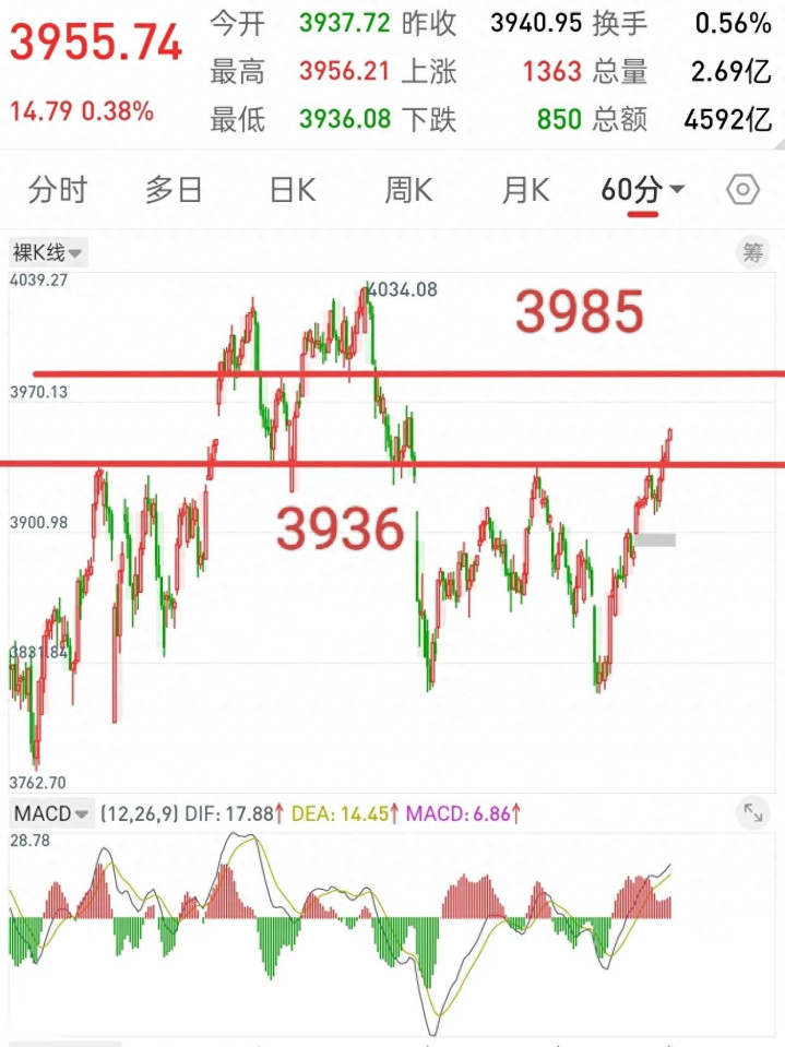 短期压力位: 当然,一口吃不成胖子。在冲向4000点大关之前,3985点是近期的一个成交密集区,也是短线的第一道坎。只要量能保持在2万亿左右,拿下3985点只是时间问题。